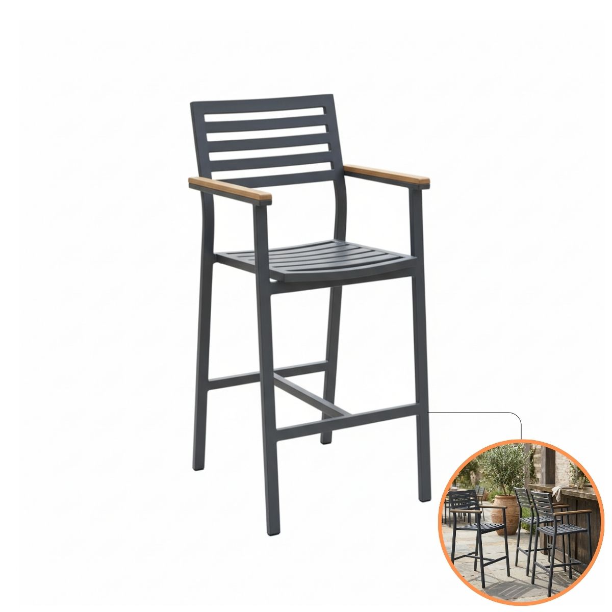 Banqueta Alta Linea Premium NossaKasa em Alumínio Ripado com Braço em Madeira – Design Industrial de Alto Padrão