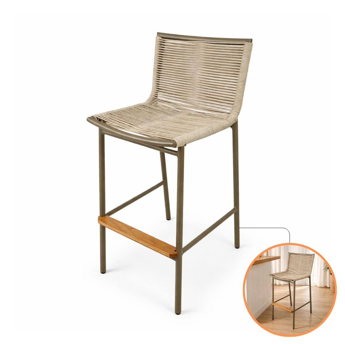 O trançado em corda náutica oferece um visual leve e orgânico, enquanto a estrutura em alumínio garante uma durabilidade eterna. O grande diferencial está no apoio para os pés em madeira maciça, que além de conferir um charme extra, proporciona um conforto tátil superior para quem utiliza a banqueta por longos períodos.