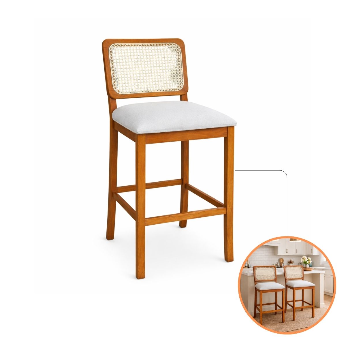 Conforto Ergonômico: Assento estofado com espuma de alta densidade e tecido de toque suave, proporcionando a ergonomia perfeita para ilhas e bancadas gourmet.