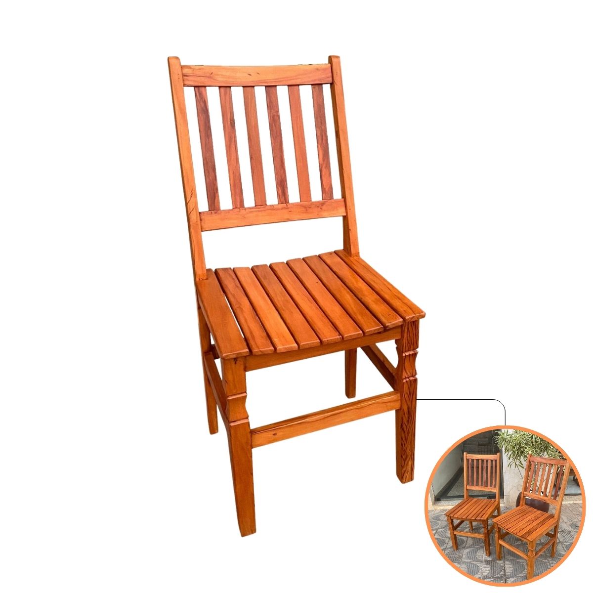 Com seus característicos detalhes entalhados nas pernas e o assento ripado milimetricamente ajustado, ela oferece o conforto térmico da madeira nobre e a segurança de uma estrutura indestrutível.