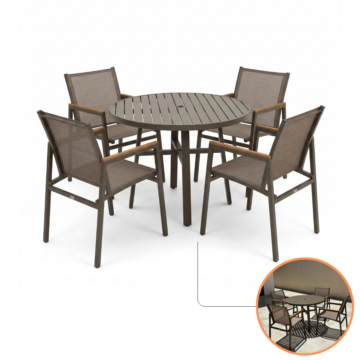 Conjunto Verona Premium NossaKasa – Mesa Redonda em Alumínio e 4 Poltronas Premium com Braço em Madeira