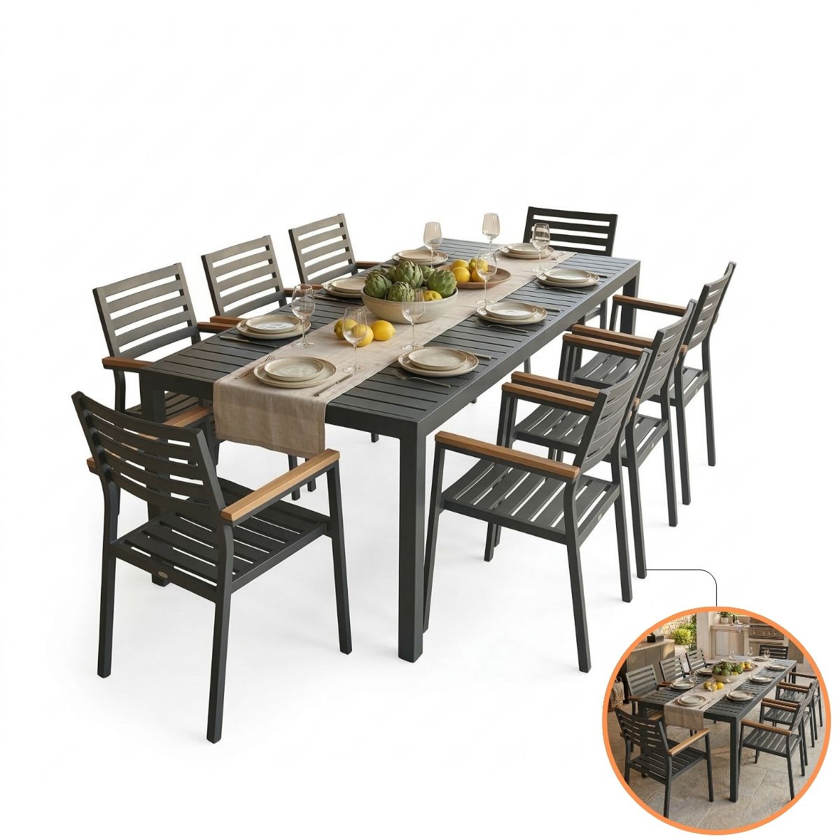 Se você tem uma área gourmet ampla ou um deck que é o ponto de encontro da família, o Conjunto Industrial de 8 Lugares da NossaKasa é a sua melhor escolha. Este jogo de mesa retangular une a estética clean do alumínio ripado com o conforto térmico da madeira maciça, criando um ambiente moderno que não exige manutenção constante.