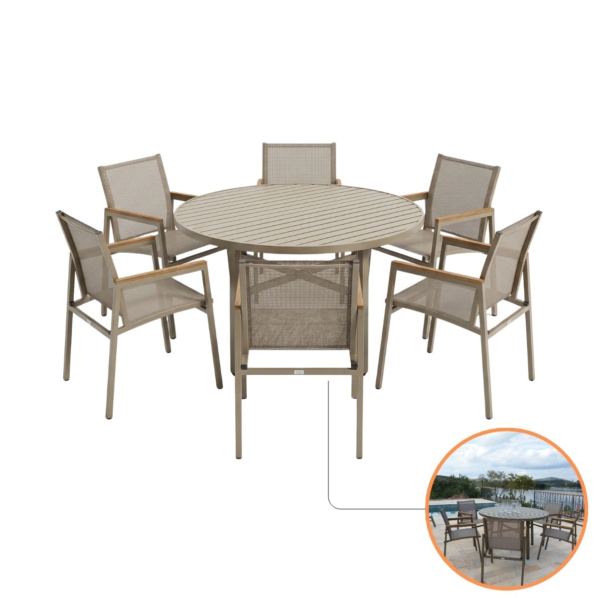 Jogo Verona Premium Móveis em Alumínio – Mesa Ripada e 6 Poltronas com Braço em Madeira