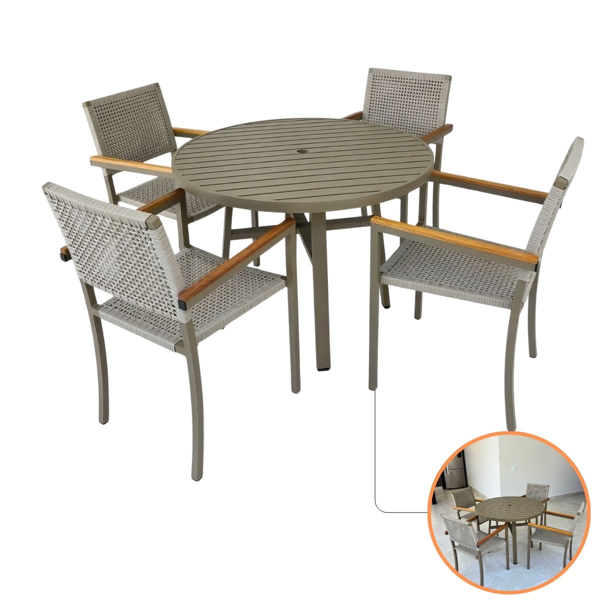 Conjunto Jantar Gourmet NossaKasa – Mesa em Alumínio e 4 Poltronas Premium com Braço em Madeira Maciça