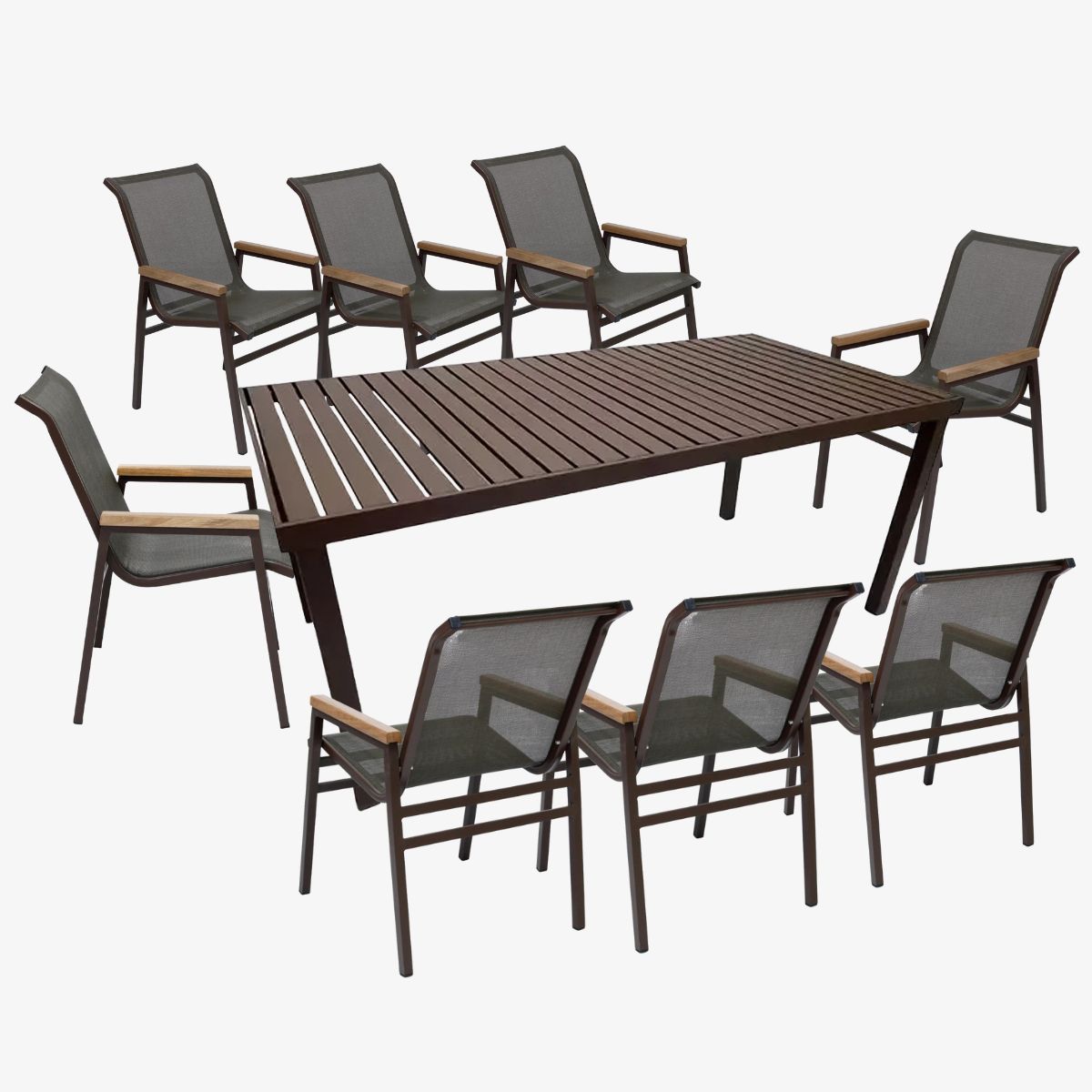 O Conjunto de Mesa Retangular Premium com tampo Ripado de Alumínio e 8 Poltronas Praia Nossa Kasa de Alumínio com Tela Sling e Detalhe de Madeira, a escolha perfeita para quem busca aliar sofisticação e funcionalidade em espaços ao ar livre ou internos.