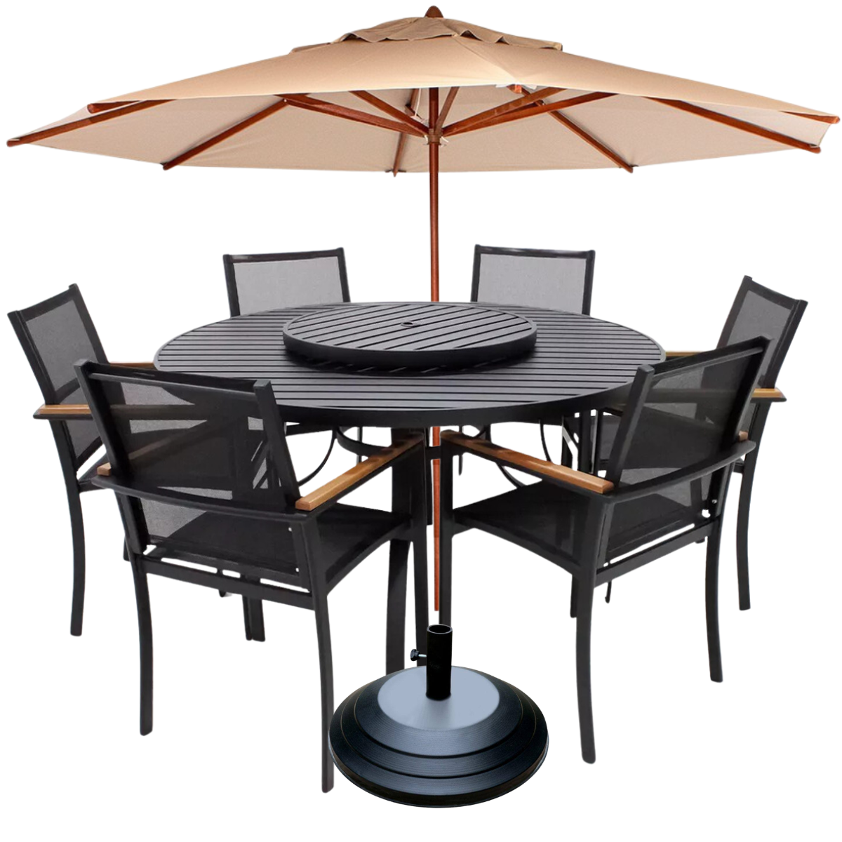 Mesa com centro giratório, estrutura que não enferruja (alumínio), tela sling de alta resistência e kit completo com ombrelone e base