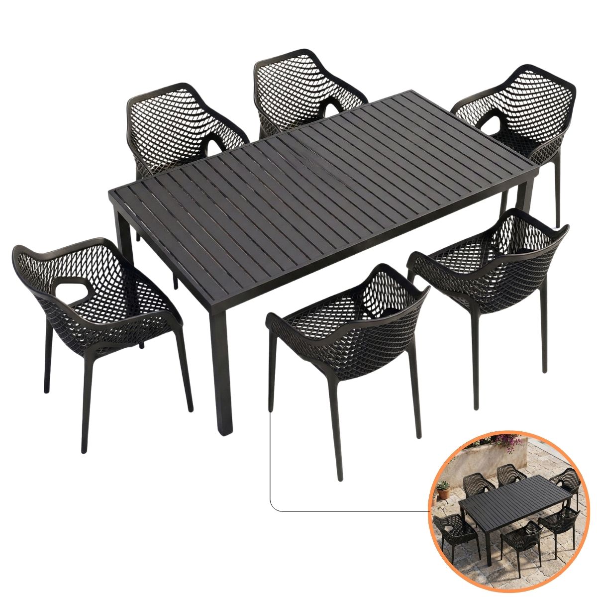 O Conjunto Suits Grand Palace da NossaKasa foi projetado para ser o protagonista do seu projeto gourmet. Unimos uma imponente Mesa Retangular de 1,80 m em Alumínio — com acabamento ripado e pintura eletrostática a pó — a 6 Cadeiras Suits, famosas por seu design futurista e braços integrados que oferecem uma ergonomia de lounge.