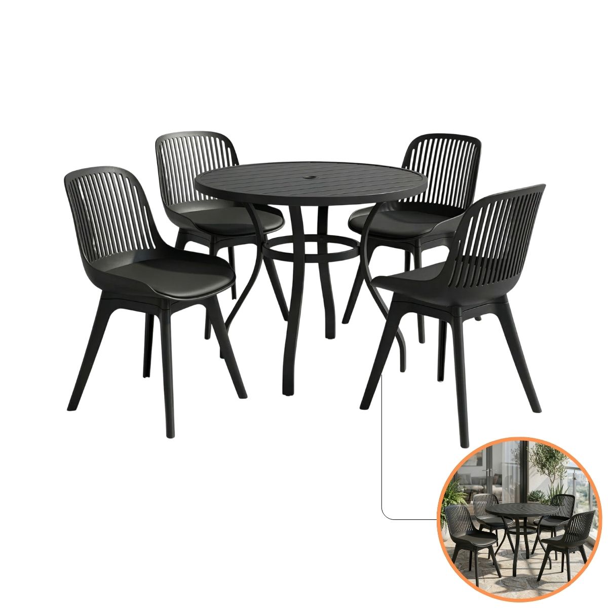 O Conjunto Garden Marcela da NossaKasa foi pensado para quem deseja unir a estética moderna das áreas externas de luxo com o conforto de uma sala de jantar interna. Este kit exclusivo traz a nossa Mesa Redonda de 90cm em Alumínio, com acabamento ripado que evita o acúmulo de água, acompanhada por 4 Cadeiras Marcela, famosas por seu encosto vazado e assento estofado premium.