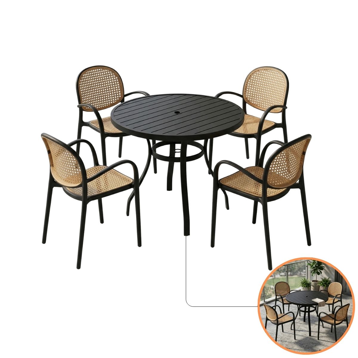 O Conjunto Garden Roma Com Braços da NossaKasa é a união perfeita entre a nostalgia do design clássico e a inovação dos materiais de alta performance. Este kit exclusivo traz a nossa Mesa Redonda de 90cm em Alumínio, com acabamento ripado e pintura eletrostática, harmonizada com 4 Cadeiras Roma, que reproduzem com perfeição a trama da palha natural.