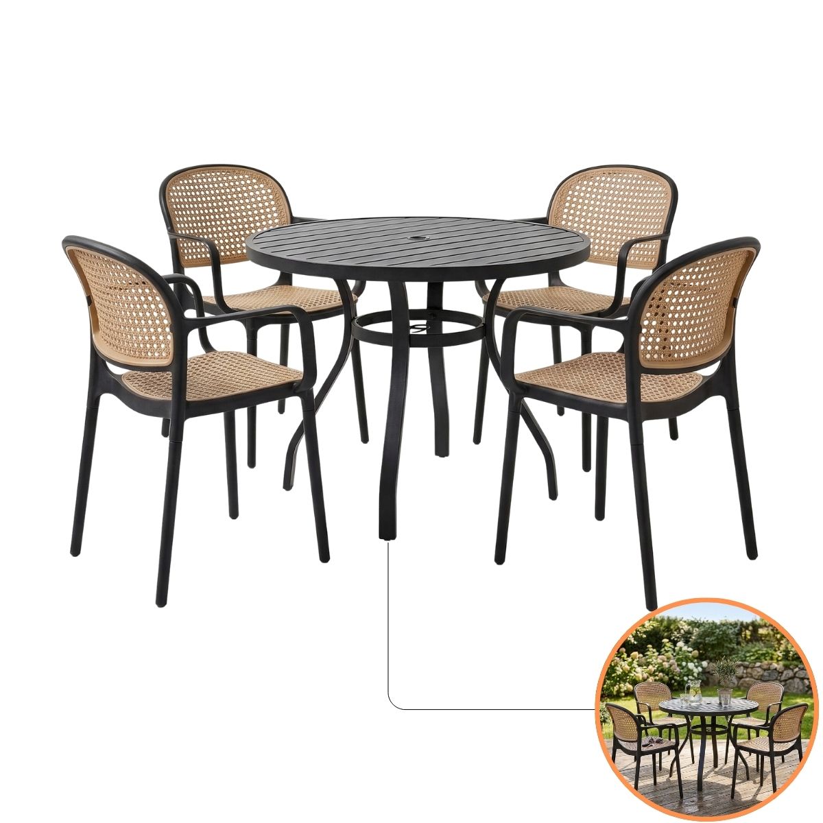 O Conjunto Garden Roma Com Braços da NossaKasa é a união perfeita entre a nostalgia do design clássico e a inovação dos materiais de alta performance. Este kit exclusivo traz a nossa Mesa Redonda de 90cm em Alumínio, com acabamento ripado e pintura eletrostática, harmonizada com 4 Cadeiras Roma, que reproduzem com perfeição a trama da palha natural.