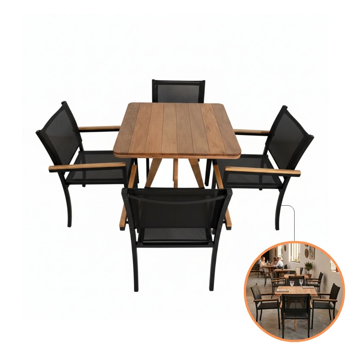 O Conjunto Indiana da NossaKasa é a escolha definitiva para empresários que não abrem mão de sofisticação e praticidade. Projetado para suportar o fluxo intenso de bares, restaurantes e hotéis, este kit une a Mesa Slim em Madeira Maciça com as Cadeiras Indiana, fabricadas em alumínio de alta densidade e tela sling de altíssima qualidade.