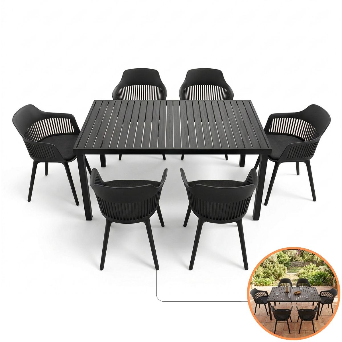 O Conjunto Dinner Marcela com braços Grand da NossaKasa redefine o conceito de jantar gourmet. Com uma imponente Mesa Retangular de 1,80m em Alumínio, este jogo foi projetado para acomodar confortavelmente 6 pessoas, unindo a resistência extrema dos materiais externos com a sofisticação de um móvel de design assinado.