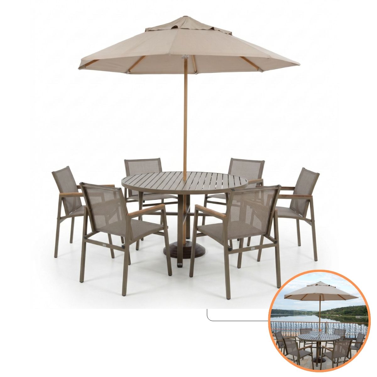 Kit de Móveis Piscina Verona Premium NossaKasa – Mesa Ripada, 6 Poltronas Premium e Kit Ombrelone Completo
