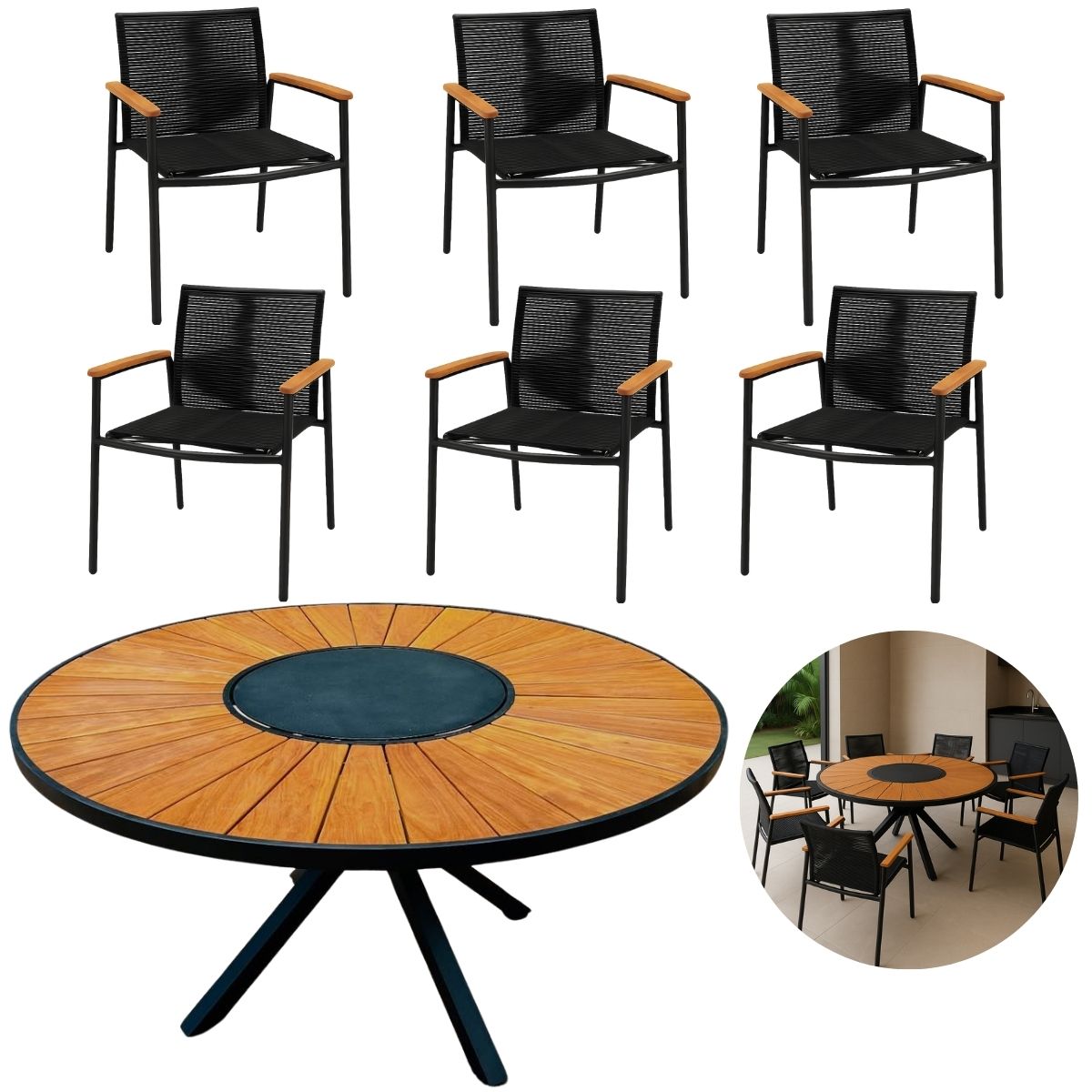 As 6 poltronas que acompanham o conjunto unem estrutura em alumínio leve e durável, assento e encosto em corda náutica trançada à mão, e braços com acabamento em madeira natural, criando uma estética sofisticada com total conforto e ergonomia. A corda náutica garante conforto térmico e é resistente aos raios UV e à umidade, tornando o conjunto perfeito para o uso contínuo e elegante em qualquer estação.