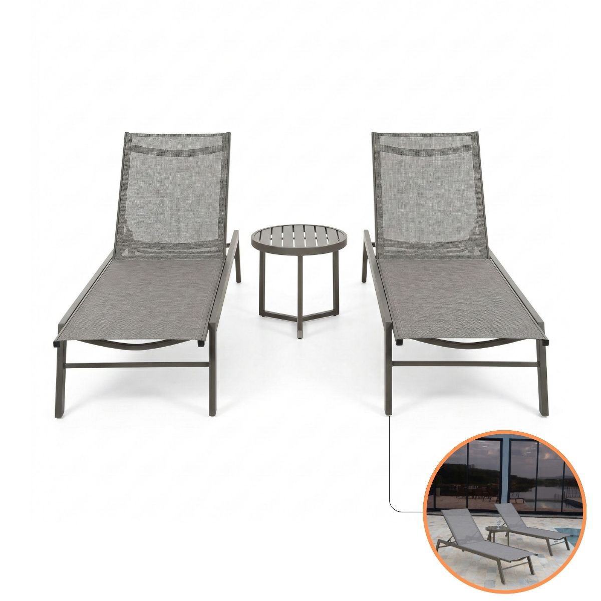 Kit Verona Premium NossaKasa – 2 Espreguiçadeiras Reclináveis em Alumínio e Tela Sling + Mesinha de Apoio Lateral